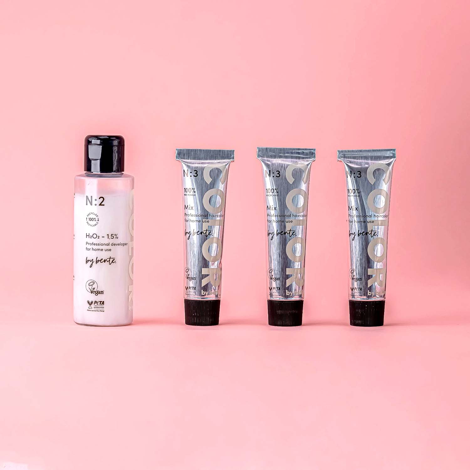 Permanent hårfarge, er en heldekkende hårfarge som ikke vaskes ut. Hårfargen inneholder riktig mengde pigment utifra det skandinaviske håret. Luktfri, skånsom og pleiende hårfarge. Farge til lang ettervekst. N:2 h2o2 90ml + tre tuber N:3 Mix blandes sammen. Velg h2o2 og fargemix utifra ønske. Les mer om fargelære her, eller kjøp via konsultasjon her og Bente tilpasser innhold utifra ditt hår, ditt utgangspunkt og ønske om resultat.